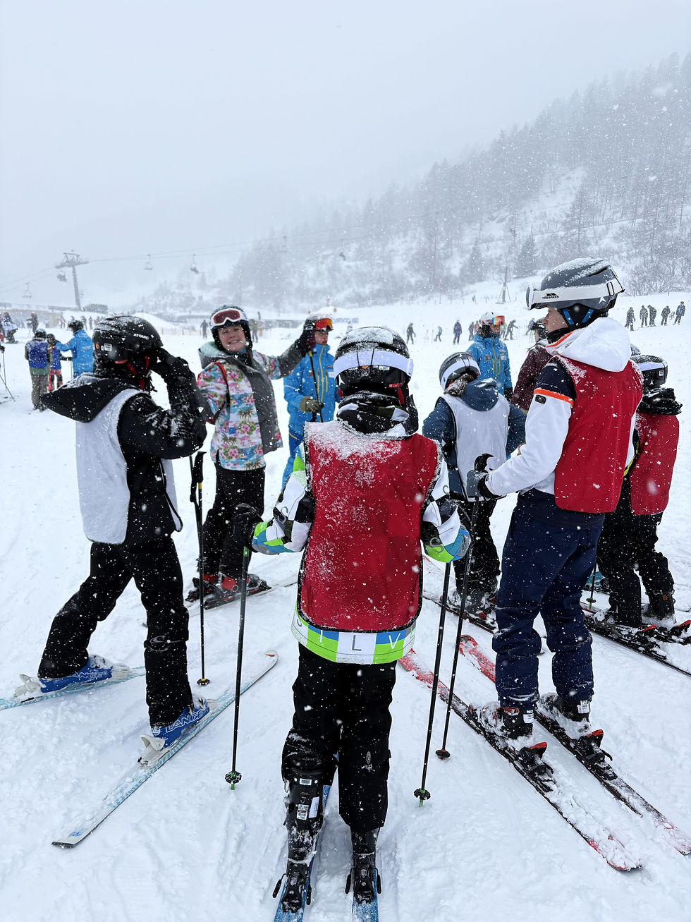 This morning we were met with a compete white out! Visibility was very challenging and the snow made it difficult to turn. Nevertheless, we had all but one beginner group move onto the main slopes - which is great!